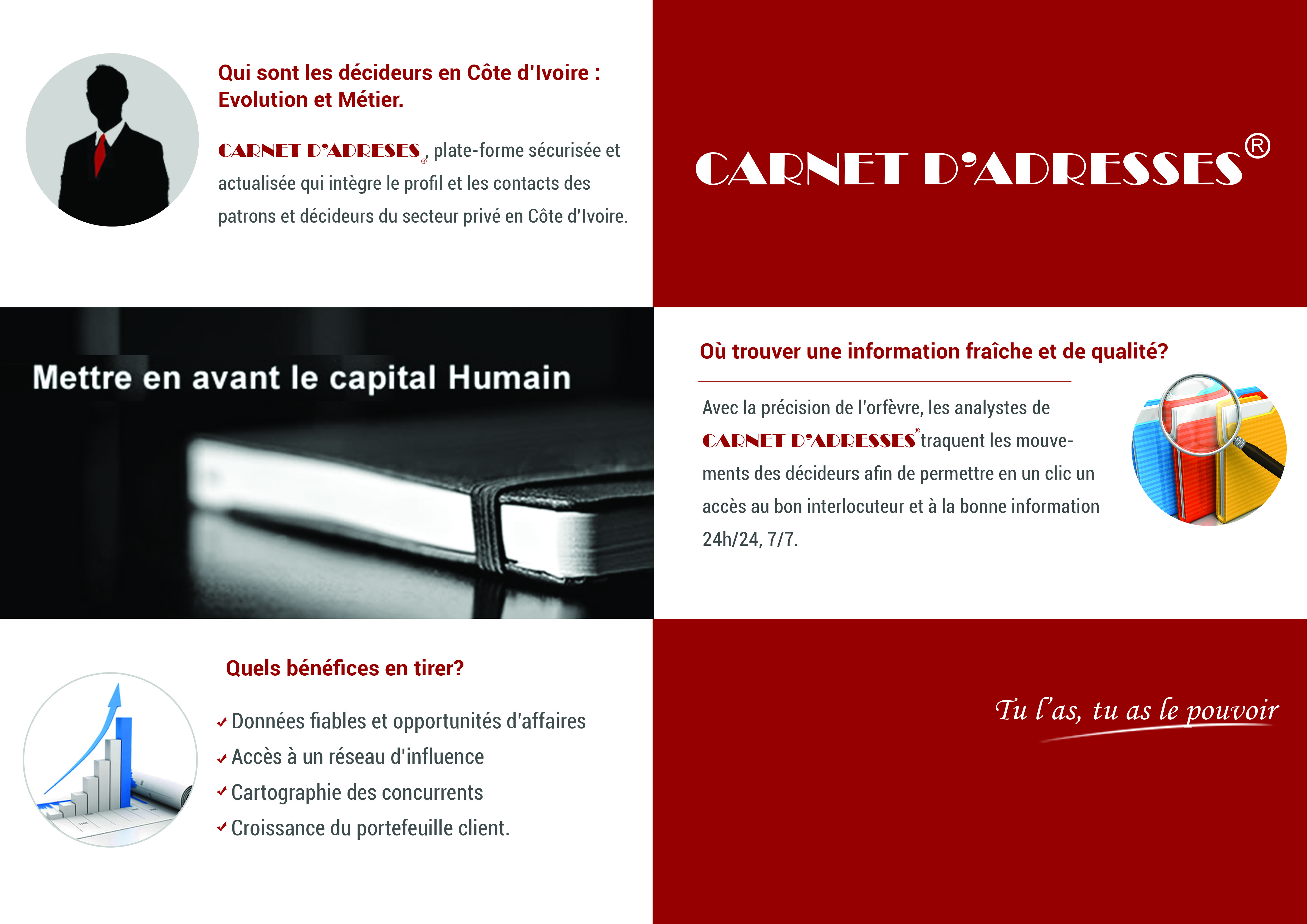 Il s’agit d’une marque déposée dans 15 pays d’Afrique. Le socle du métier de CARNET D’ADRESSES® est de connaître et faire connaître les décideurs en mouvement :